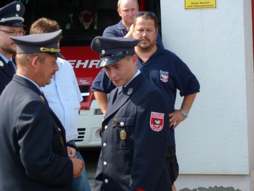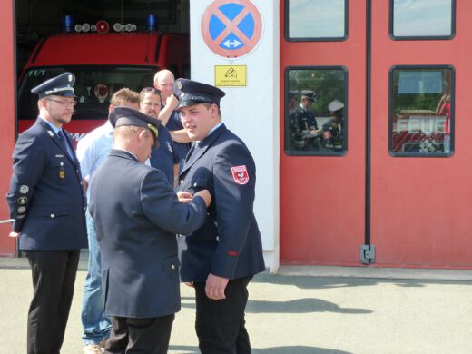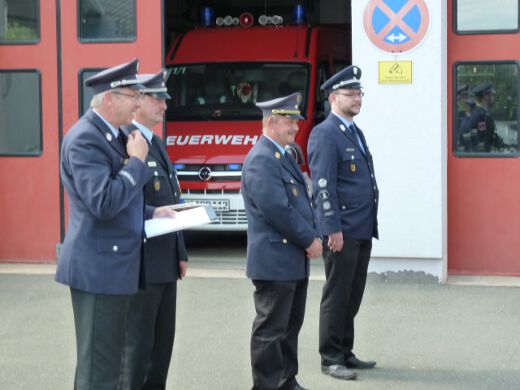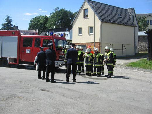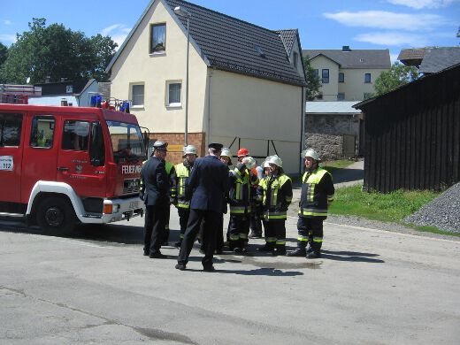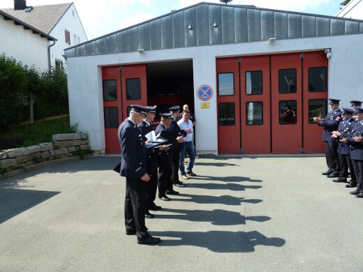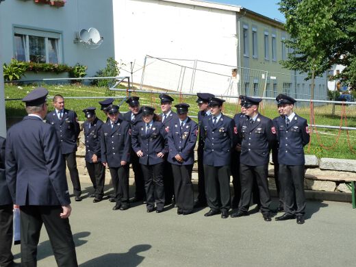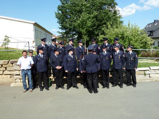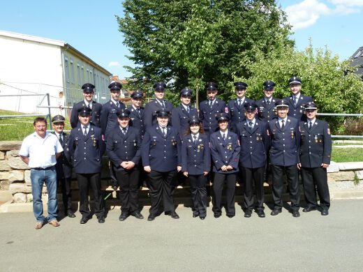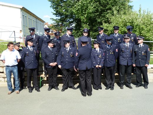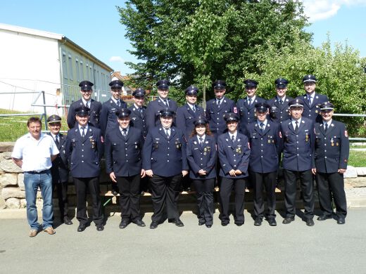 vorne: Bürgermeister Stefan Müller, Kreisbrandinspektor Thomas Reuther, Florian Steinhäußer, Michael Funk, Andreas Steinhäußer, Simone Steinhäußer, Lisa Rietzsch, Marco Krannich, Kreisbrandmeister Gerhard Schmidt, Kreisbrandmeister Philipp Kemnitzer