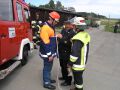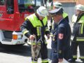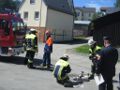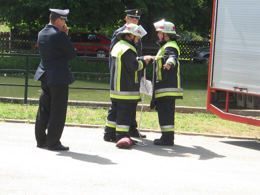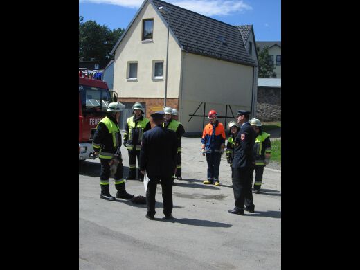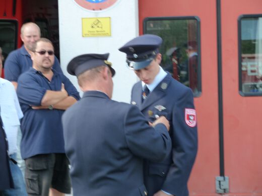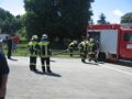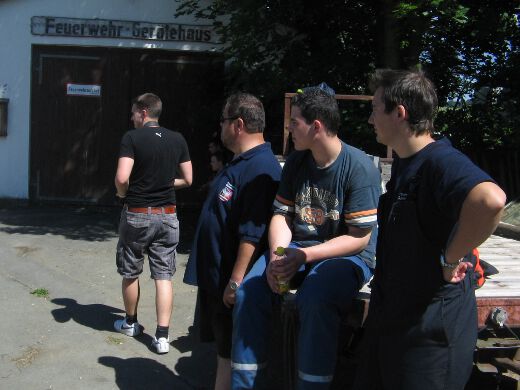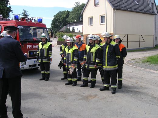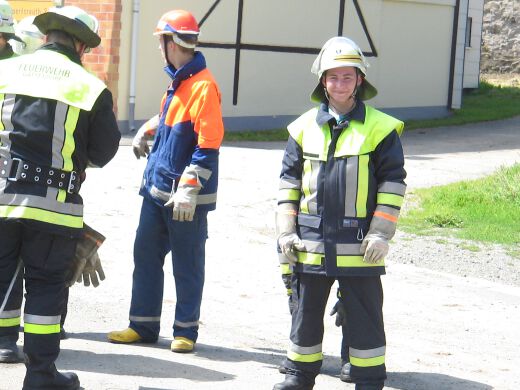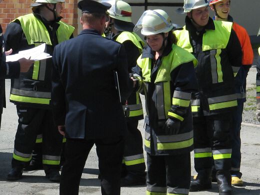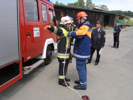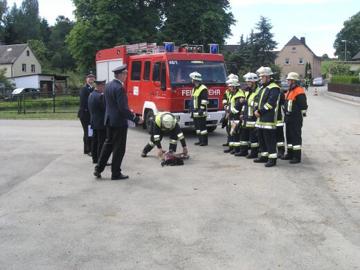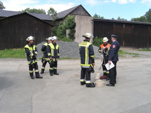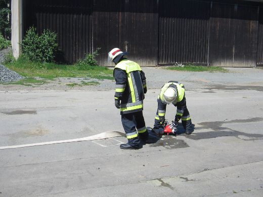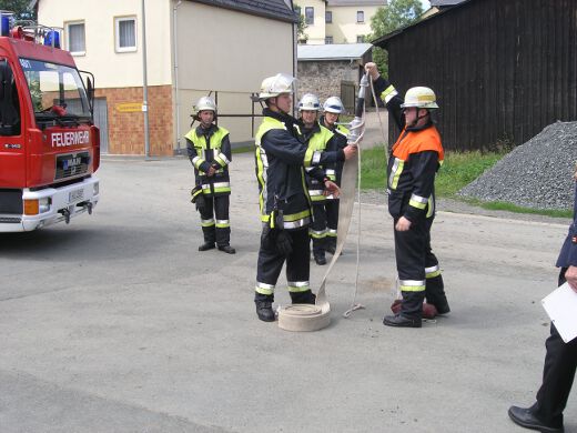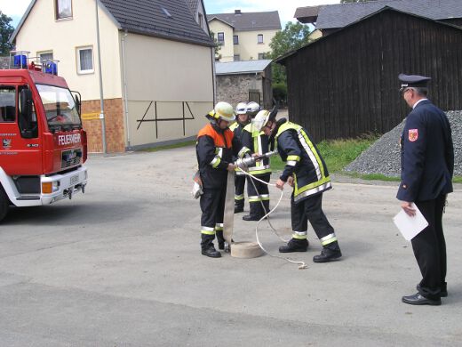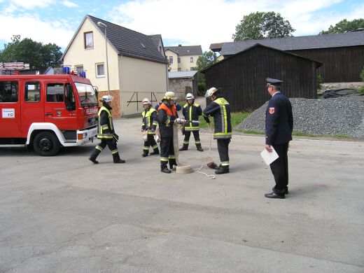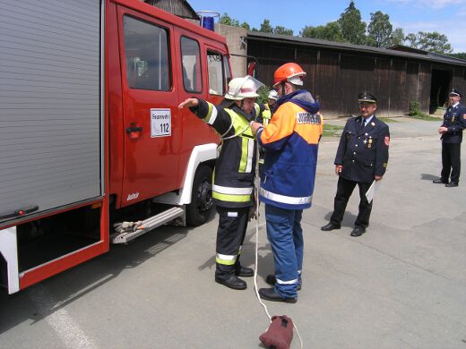 Neben dem Vorführen verschiedener Knöten und Stiche wurden allerhand Kenntnisse aus den Bereichen Gerätekunde, Erste Hilfe, Gefahrgut sowie Allgemeinwissen rund um den Feuerwehrdienst abgefragt. Außerdem galt es in einer Zeit von höchstens vier Minuten einen kompletten Löschangriff zu erstellen. Dazu mussten eine Saugleitung gekuppelt, ein Verteiler gelegt und - als angenommene Brandobjekte - einige Eimer umgespritzt werden.