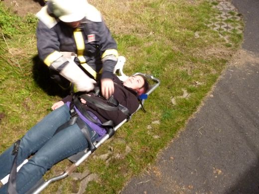 Angenommen wurde ein Verkehrsufall mit zwei PKW und mehreren zum Teil eingeklemmten Personen. Da die Unfallopfer über Schmerzen im Halswirbelbereich klagten wurden sie mittels einer Halskrause stabilisiert.