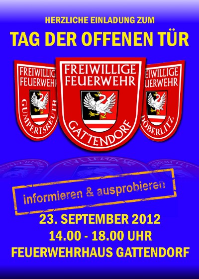 Die Feuerwehren der Gemeinde Gattendorf laden alle Bürgerinnen und Bürger ganz herzlich zum 1. Tag der offenen Tür ins Feuerwehrgerätehaus nach Neugattendorf ein. Am 23. September 2012 ab 14.00 Uhr bieten die Kameraden ihren Besuchern einen umfassenden Einblick in und rund um das Thema Feuerwehr. Das Angebot richtet sich an Interessierte sämtlicher Altersgruppen.