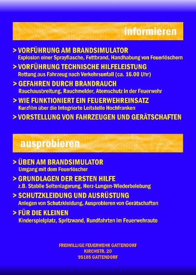Das Motto der Veranstaltung lautet: Informieren und ausprobieren. So werden bei verschiedenen Vorführungen Fragen geklärt wie: Was passiert bei einer Fettexplosion? Wie breitet sich Brandrauch aus? Wie geht Erste Hilfe?