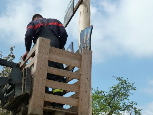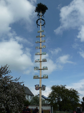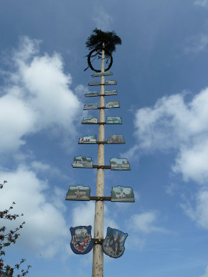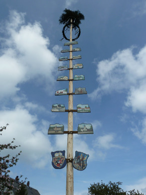 Die 17 handgemalten Tafeln, die den Stamm des Maibaumes schmücken, zeigen verschiedene Einrichtungen, Handwerksberufe und Wahrzeichen der Gemeinde.