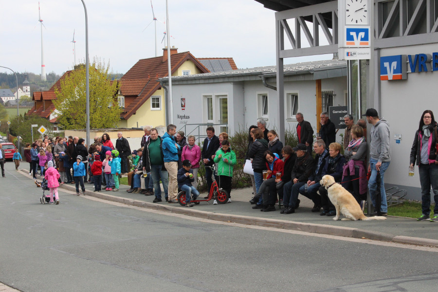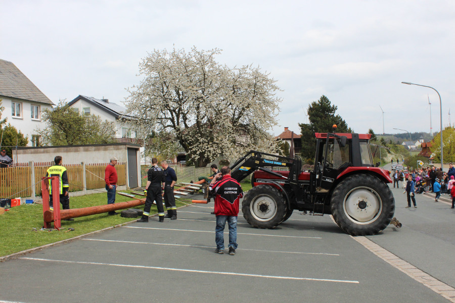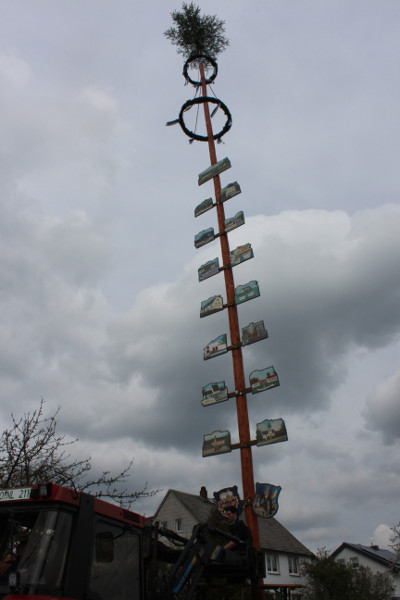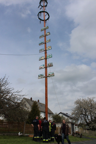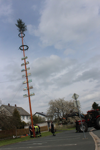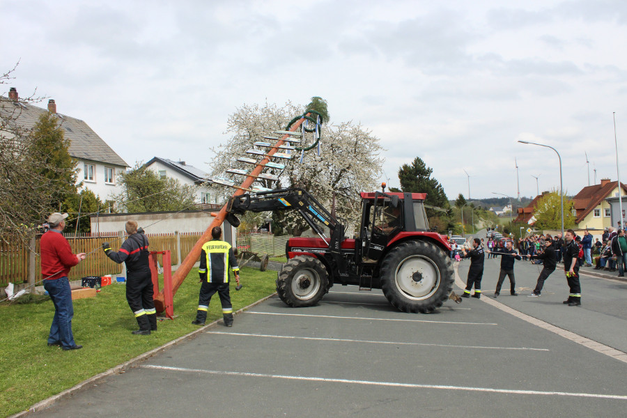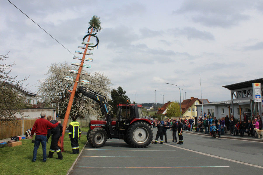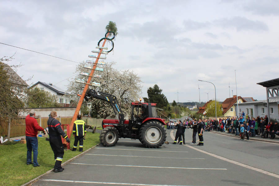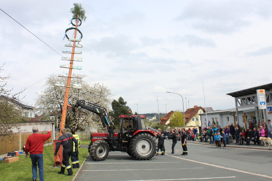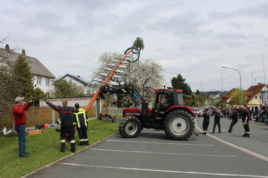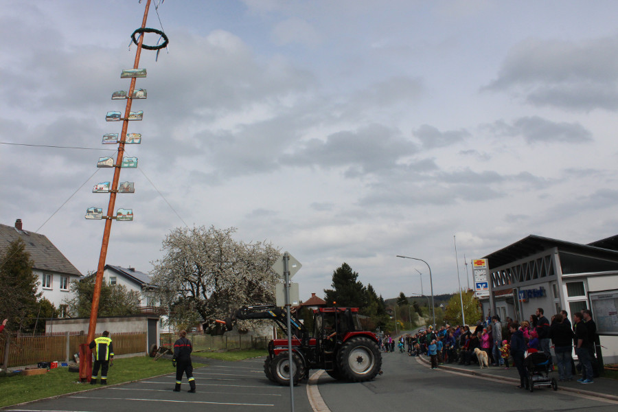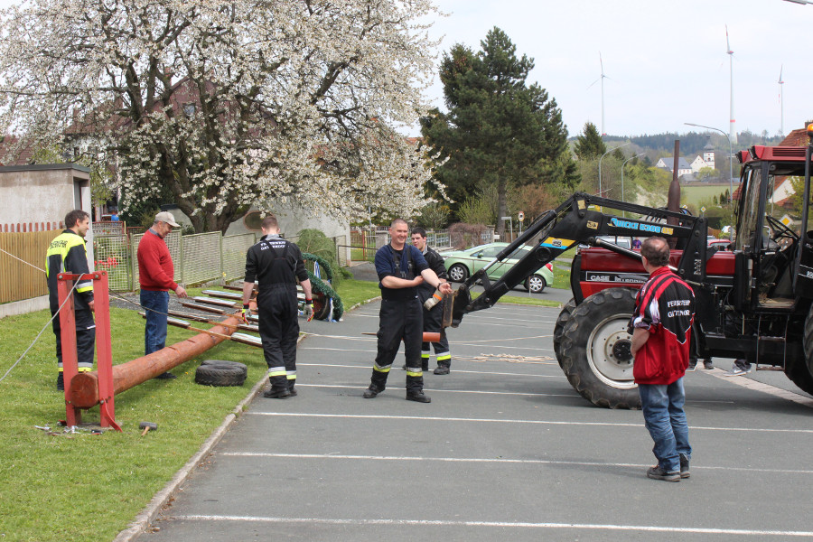 Zahlreiche Schaulustige hatten sich auch heuer am Bürgerhaus „Alte Schule“ eingefunden, um die Mitglieder des Feuerwehrvereins dabei zu beobachten, wie sie mit Hilfe von zwei Traktoren und Muskelkraft den Maibaum aufstellten. Nach getaner Arbeit wurden sie dafür von den neugierigen Zuschauern mit anerkennendem Beifall bedacht.