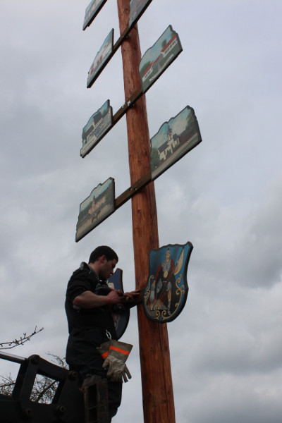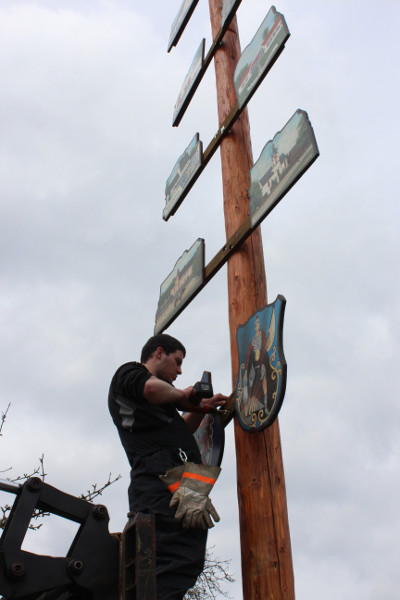 Die 17 handgemalten Tafeln, die den Stamm des Maibaumes schmücken, zeigen verschiedene Einrichtungen, Handwerksberufe und Wahrzeichen der Gemeinde.